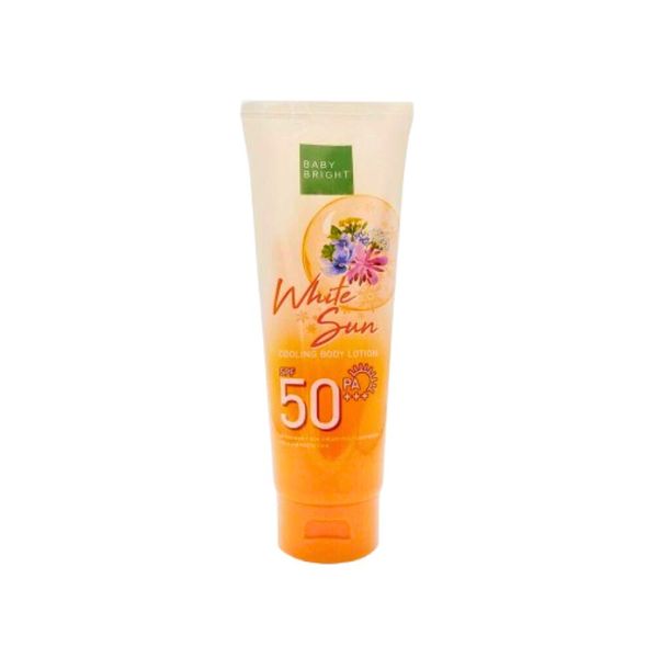 BABY BRIGHT White Sun Cooling Body Lotion โลชั่นกันแดดสำหรับผิวกาย สูตรเย็นสดชื่น ซึมซาบไว ไม่เหนียวเหนอะหนะ พร้อมบำรุงผิวให้กระจ่างใส ปกป้องผิวจากรังสี UVA/UVB ด้วย SPF50 PA+++ ป้องกันแดดได้สูงถึง 50 เท่า