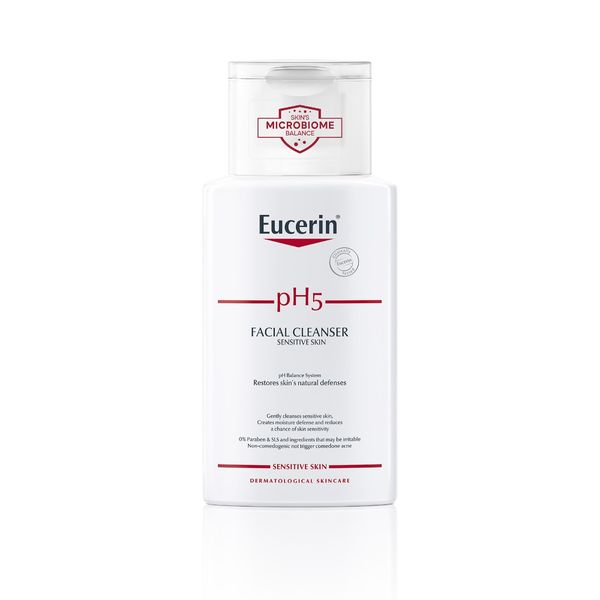 Eucerin pH5 Sensitive Skin Facial Cleanser ผลิตภัณฑ์ทำความสะอาดผิวหน้าสูตรอ่อนโยน เหมาะสำหรับผิวบอบบางแพ้ง่าย ด้วยนวัตกรรม Sensitive Defense ช่วยปกป้องการทำงานของเอนไซม์ในผิว ทำความสะอาดอย่างอ่อนโยนโดยไม่ทำลายสมดุลผิว
