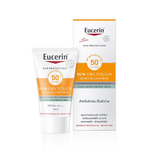 Eucerin Sun Dry Touch Oil Control SPF50+ ครีมกันแดดสำหรับผิวหน้า ผิวมันเป็นสิวง่ายและผิวบอบบางแพ้ง่าย ช่วยคุมความมันยาวนานถึง 8 ชั่วโมง ลดโอกาสเกิดสิวอุดตัน พร้อมปกป้องผิวจากรังสี UVA/UVB และ High Energy Visible Light (HEV) ลดจุดด่างดำ ฝ้าแดดฝังลึก และริ้วรอยสิว