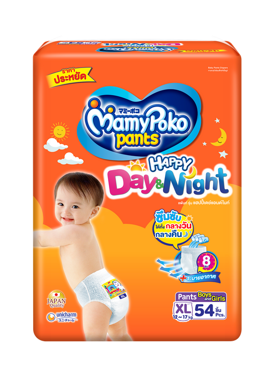 MAMY POKO Pants Happy DAY&NIGHT กางเกงผ้าอ้อมเด็ก ขนาด XL จำนวน 54 ชิ้น ซึมซับได้นานถึง 8 ชั่วโมง ใช้ได้ทั้งกลางวันและกลางคืน พร้อมแผ่นระบายอากาศช่วยลดความอับชื้น ให้ลูกน้อยสบายตัวตลอดวัน เหมาะสำหรับคุณพ่อคุณแม่ที่ต้องการความสะดวกสบายและมั่นใจในการปกป้องลูกน้อย