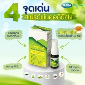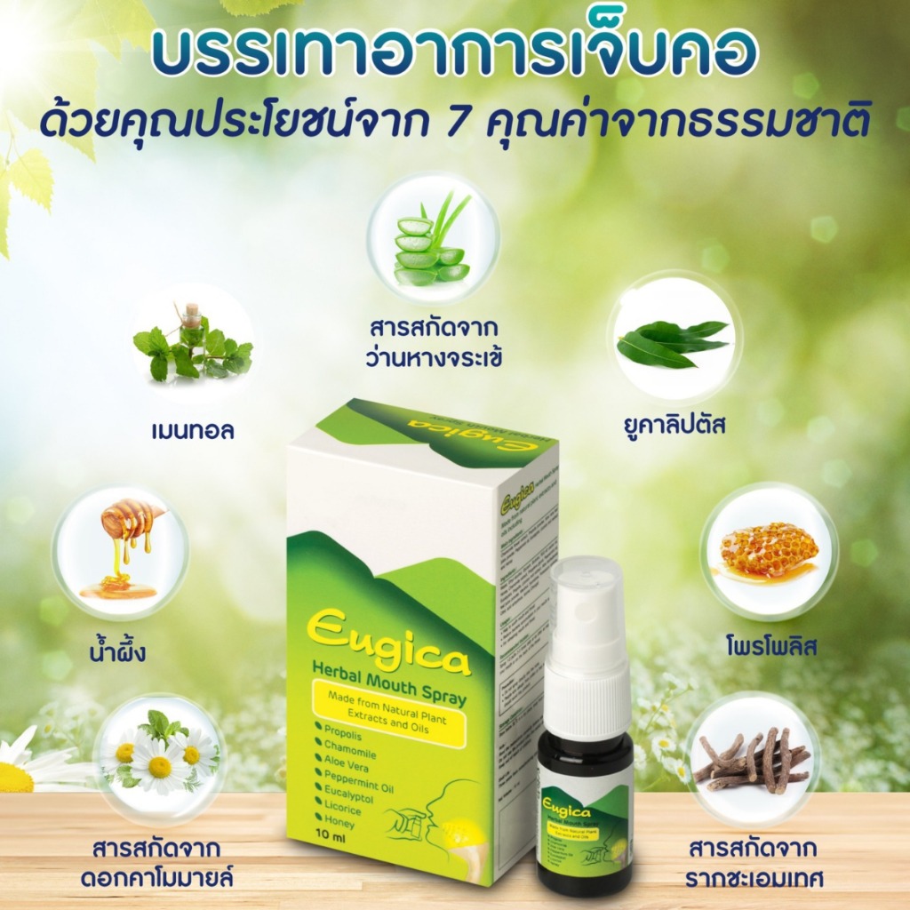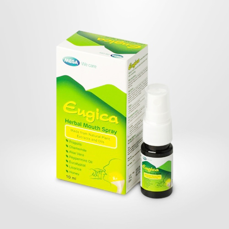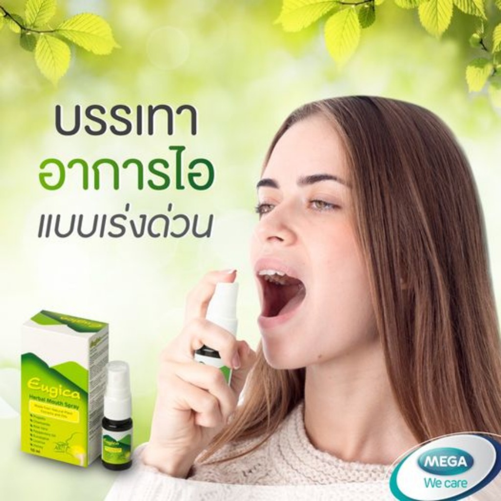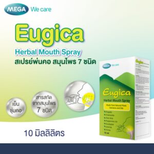 MEGA Eugica Herbal Mouth Spray สเปรย์พ่นคอคุณภาพจาก MEGA We Care ที่ผสานพลังของสมุนไพร 7 ชนิด ช่วยบรรเทาอาการระคายคอ เจ็บคอ และอาการไอจากภูมิแพ้ หรือการติดเชื้อเบื้องต้น พร้อมกลิ่นหอมเย็นสดชื่น ใช้ง่าย ปลอดภัย ใช้ได้ทุกวันโดยไม่ก่อให้เกิดอาการแพ้หรือดื้อยา