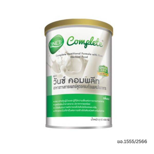 Otsuka Once Complete (วันซ์ คอมพลีท) เป็นอาหารทางการแพทย์สูตรครบถ้วนผสมใยอาหาร ออกแบบมาเพื่อช่วยเติมเต็มสารอาหารที่จำเป็น เหมาะสำหรับผู้ป่วยและผู้ที่มีความเสี่ยงต่อการขาดสารอาหาร รวมถึงผู้ที่มีภาวะเสียสมดุลทางโภชนาการ สูตรไม่เติมน้ำตาลทราย และปราศจากแลคโตส