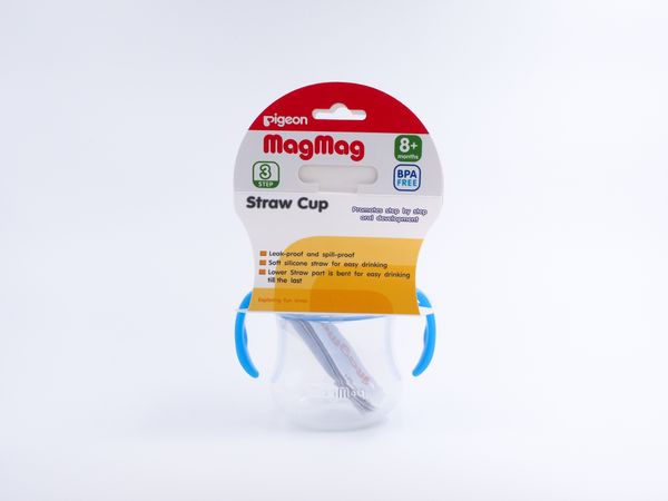 Pigeon ถ้วยหัดดื่ม Mag Mag Step 3 สีฟ้า ออกแบบเพื่อช่วยฝึกเด็กอายุ 8 เดือนขึ้นไปให้ดื่มน้ำจากแก้วได้เหมือนผู้ใหญ่ ด้วยจุกหลอดซิลิโคนที่ปลอดภัย ป้องกันน้ำรั่วซึม ฝาปิดแนบสนิท หูจับกว้างจับถนัดมือ ตัวถ้วยทนความร้อนสูงสุด 110 องศาเซลเซียส เหมาะสำหรับเด็กฝึกดื่มน้ำด้วยตัวเอง
