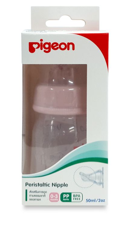Pigeon ขวดนม PP ขนาด 50 มล. พร้อมจุกนมเสมือนนมมารดา รุ่นมินิ ขนาด S สำหรับทารกแรกเกิด – 3 เดือน ผลิตจากพอลิโพรไพลีน (PP) คุณภาพสูง ปลอดสาร BPA และ BPS ทนความร้อนได้ถึง 110 °C
