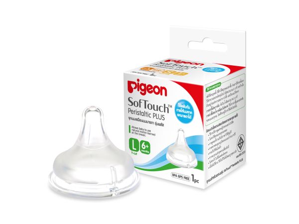 Pigeon SofTouch Peristaltic Plus Size L จุกนมออกแบบตามขั้นตอนการดูดนมตามธรรมชาติของทารก เหมาะสำหรับทารกอายุ 6 เดือน ช่วยให้ดูดนมเสมือนการดูดจากอกมารดา ระบบ Air Ventilation System (AVS) ปรับสมดุลความดันภายในขวด ลดอาการท้องอืดและโคลิก