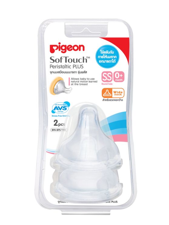 Pigeon จุกนมเสมือนนมมารดา รุ่น Plus ขนาด SS แพค 2 ชิ้น สำหรับทารกแรกเกิด ผลิตจากซิลิโคนคุณภาพสูง ทนความร้อนได้ถึง 120 °C มีความนุ่มพิเศษและยืดหยุ่นสูง ออกแบบตามขั้นตอนการดูดนมตามธรรมชาติ ให้ทารกดูดนมเหมือนดูดนมจากอกมารดา