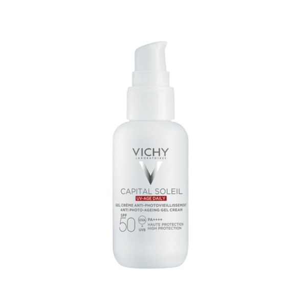 Vichy Capital Soleil UV Age Daily SPF50/PA++++ ครีมกันแดดสำหรับผิวหน้า สูตรปกป้องสูง ลดเลือนสัญญาณวัย ปกป้องผิวจากรังสี UVA, UVB และมลภาวะ เหมาะสำหรับทุกสภาพผิว แม้ผิวบอบบางและรอบดวงตา